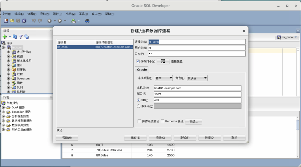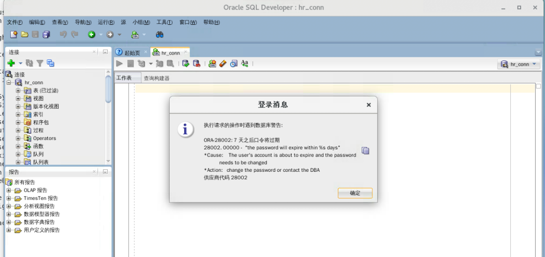 - 在SQLdeveloper中,使用鼠标右键打开hr_conn连接属性,修改主机名为host01.example.com(注意不是wyzc.example.com),点击「保存」后点击「连接」,它打开这个连接下面的所有对象,此时右边出现口令将要过期提示,这个是正常提示,以后会加以更正,点击「确定」先忽略此提示。