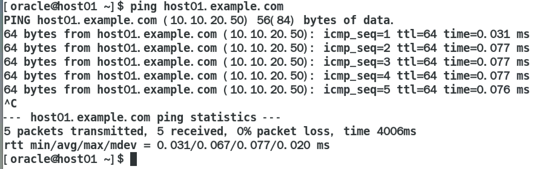 退出此图形界面,回到步骤i)的命令行界面 , 再次使用ifconfig命令验证IP地址是否添加正确;可以进一步使用ping确认主机名返回正确的IP地址(10.10.20.50)。使用ctrl+c中断此命令输出。
