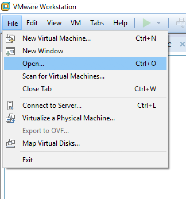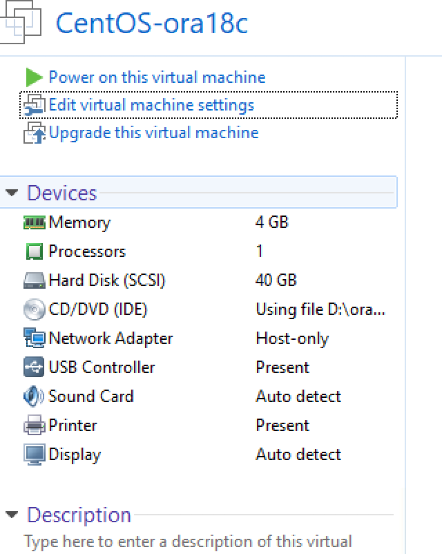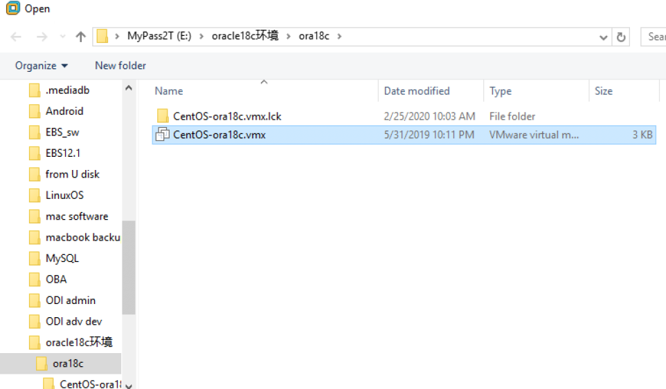 - 点击file(文件)-> open (打开), 然后在下载目录中选择虚拟机的配置文件CentOS-ora18c.vmx。