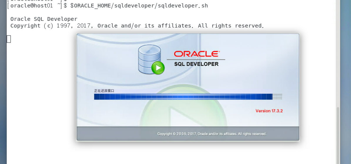 - 打开SQLdeveloper图形化界面,此工具为SQL语句课堂练习环境,确保正确打开 。 注意命令行为$ORACLE_HOME/sqldeveloper/sqldeveloper.sh, 注意需要输入$符号,命令行大小写敏感。正确输入命令行后, 可以看到图形化界面打开