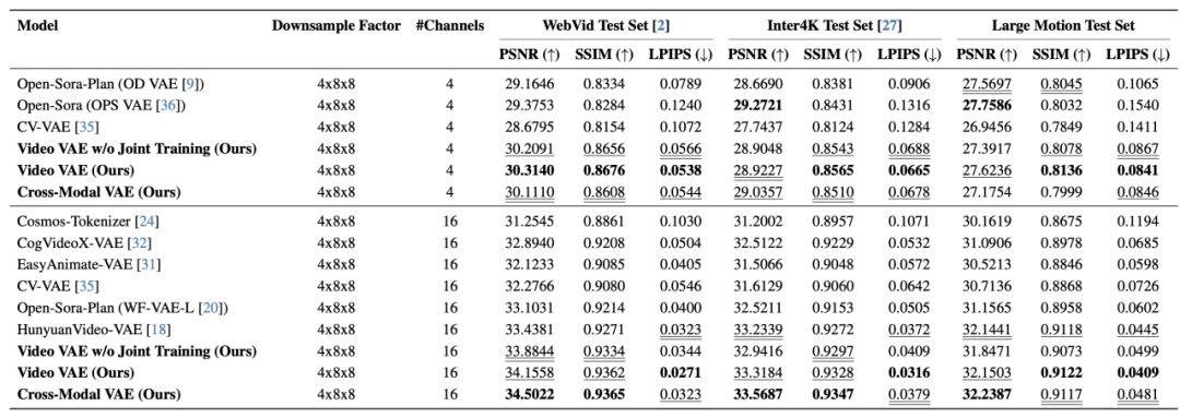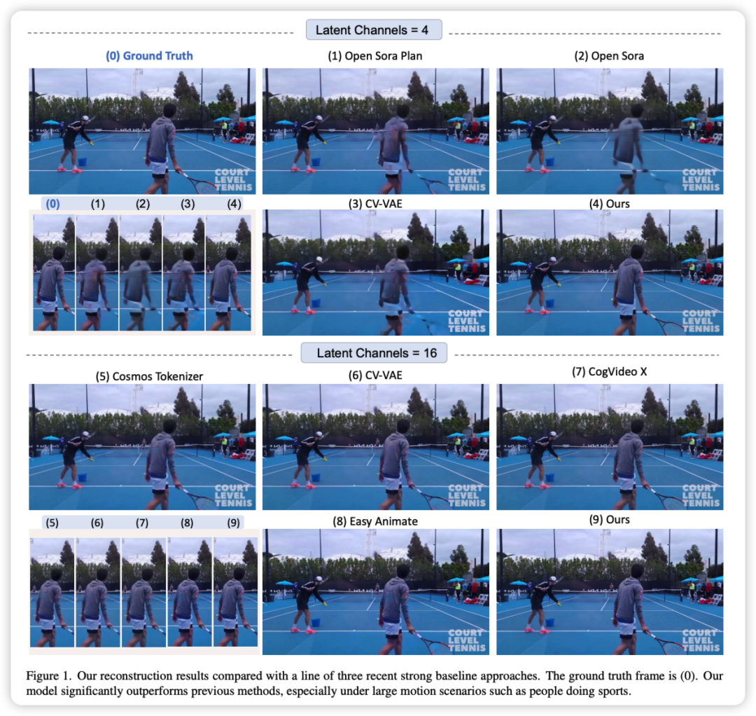 该研究的 VideoVAE + 模型大幅超过最新模型包括英伟达在 2024.11 发布的 Cosmos Tokenizer,同时也超越一众方法包括腾讯在 2024.12 发布的 Hunyuan Video,CogvideoX VAE, WF-VAE,CV-VAE,Open Sora,Open Sora Plan, Easy Animate-VAE。