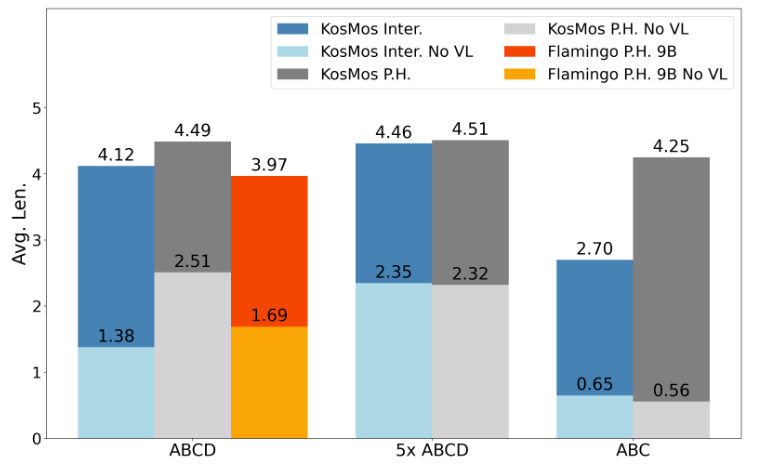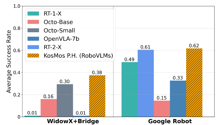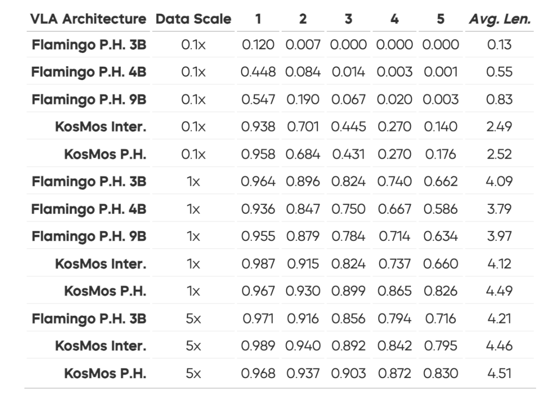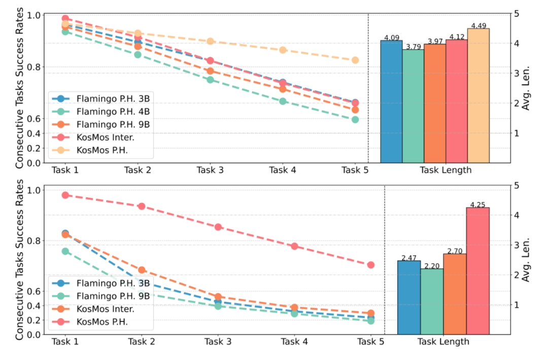 我们对比了当前主流的 8 种视觉语言模型(VLM),结果发现 KosMos 和 Paligemma 的表现遥遥领先,轻松碾压其他模型。无论是任务完成的精确度还是泛化能力,它们都展现出了压倒性的优势。究其原因,主要得益于它们经过了扎实且全面的视觉语言预训练,从而为模型提供了强大的先验知识和理解能力。
