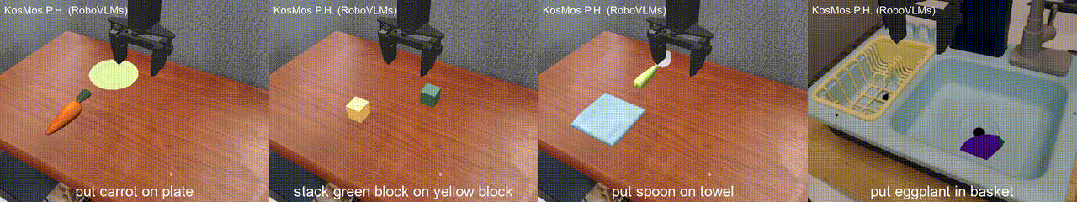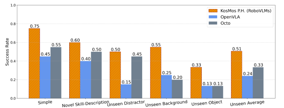 对于未见过的技能描述、背景、干扰物体和目标物体,RoboVLMs 均能很好的完成任务。