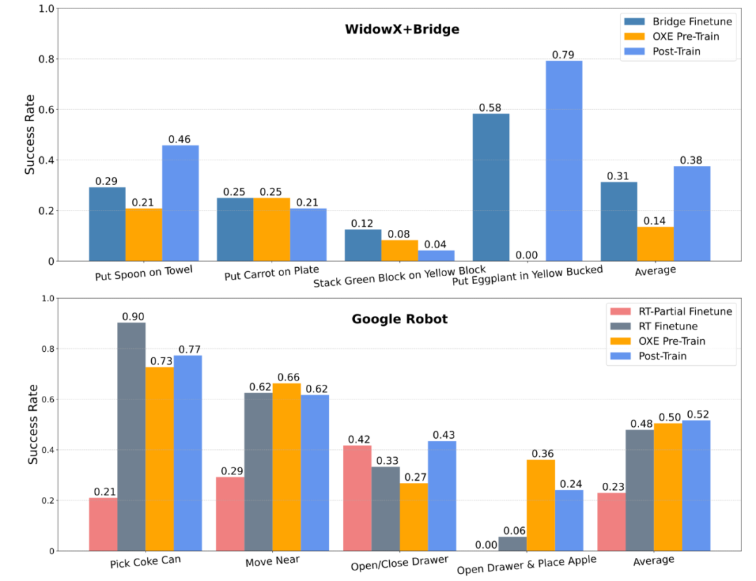 具体实验中,我们在 WidowX+Bridge 和 Google Robot 两大环境下分别进行了不同训练策略的测试: