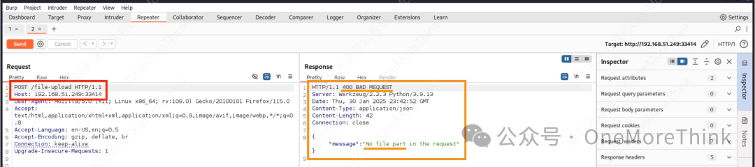 根据接口说明,使用POST请求文件上传接口/upload-file,响应400报错,BAD REQUEST,缺少file部分,需要自行构造。