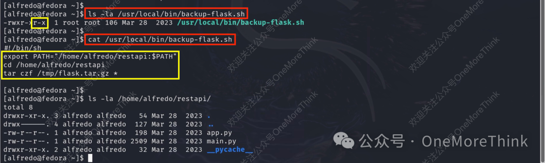 当前alfredo用户具有/usr/local/bin/backup-flask.sh脚本的查看权限。查看脚本内容,发现是将/home/alfredo/restapi/目录设为环境变量后,使用tar命令打包压缩/home/alfredo/restapi/目录。