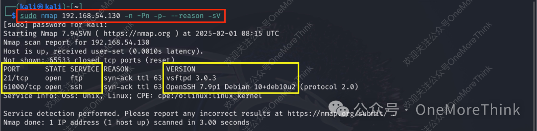 对靶机进行全端口扫描、服务扫描、版本扫描,发现21/FTP、61000/SSH。