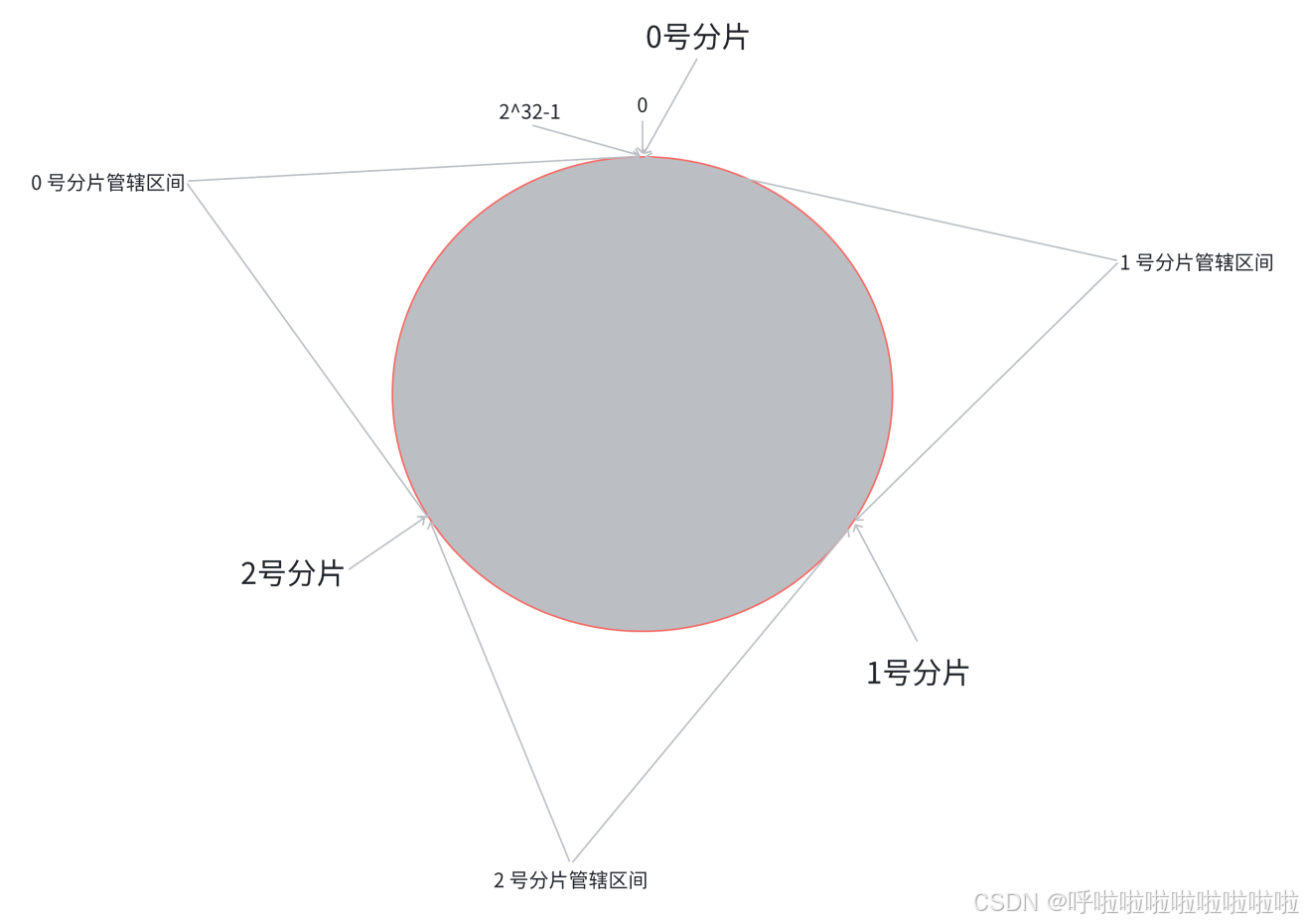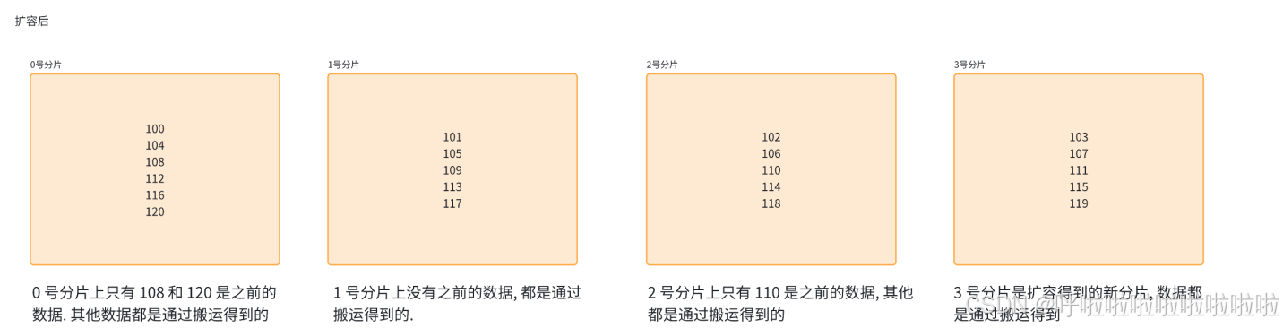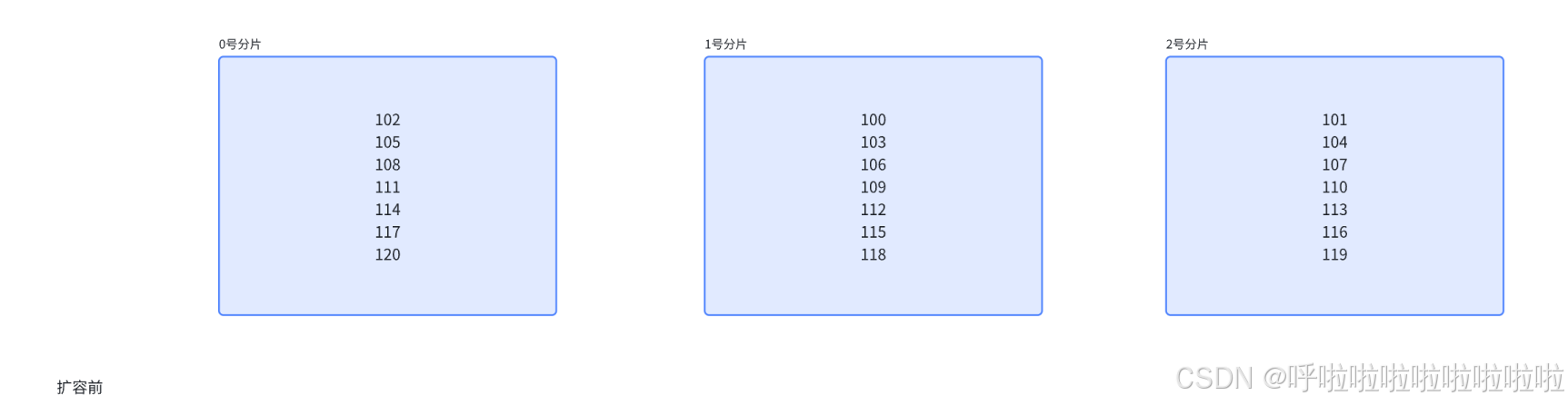 假设当前有三个分片, 一种可能的分配方式: • 0 号分片: [0, 5461], 共 5462 个槽位 • 1 号分片: [5462, 10923], 共 5462 个槽位 • 2 号分片: [10924, 16383], 共 5460 个槽位 如果需要进行扩容, 比如新增一个 3 号分片, 就可以针对原有的槽位进行重新分配. 比如可以把之前每个分片持有的槽位, 各拿出一点, 分给新分篇. ⼀种可能的分配方式: • 0 号分片: [0, 4095], 共 4096 个槽位 • 1 号分片: [5462, 9557], 共 4096 个槽位 • 2 号分篇: [10924, 15019], 共 4096 个槽位 • 3 号分片[4096, 5461] + [9558, 10923] + [15019, 16383], 共 4096 个槽位