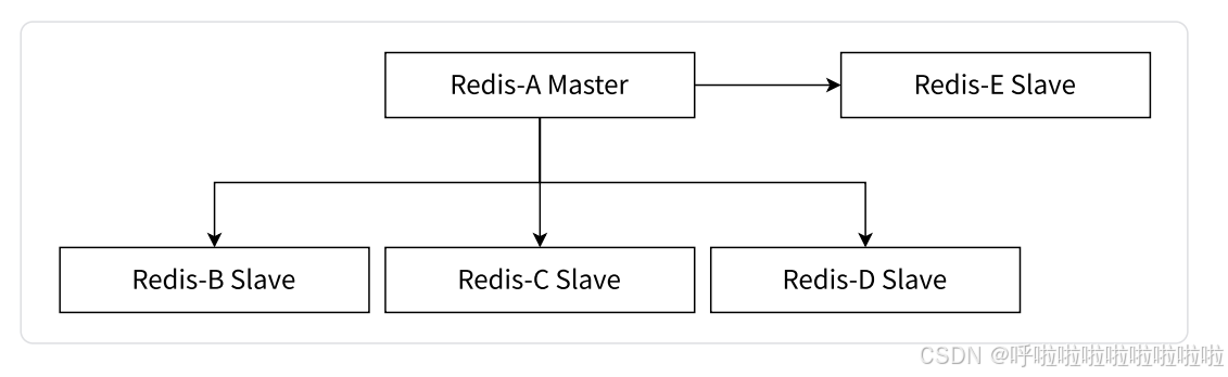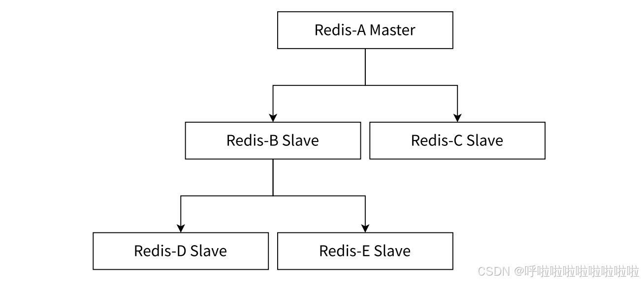 树据写入节点 A 之后会同步给 B 和 C 节点,B 节点进一步把数据同步给 D 和 E 节点。当主节点需要挂载等多个从节点时为了避免对主节点的性能干扰,但同步的延时是比刚才长的