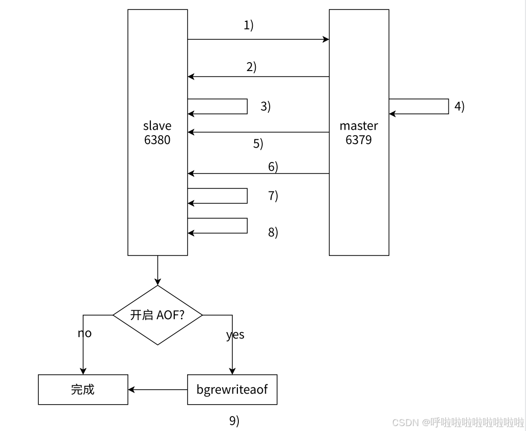 1)从节点发送 psync 命令给主节点进行数据同步,由于是第一次进行复制,从节点没有主节点的运行 ID 和复制偏移量,所以发送 psync ? -1。 2)主节点根据命令,解析出要进行全量复制,回复 +FULLRESYNC 响应。 3)从节点接收主节点的运行信息进行保存。 4)主节点执行 bgsave 进行 RDB 文件的持久化。 5)主节点发送 RDB 文件给从节点,从节点保存 RDB 数据到本地硬盘。 6)主节点将从生成 RDB 到接收完成期间执行的写命令,写入缓冲区中,等从节点保存完 RDB ⽂件后,主节点再将缓冲区内的数据补发给从节点,补发的数据仍然按照 rdb 的⼆进制格式追加写入到收到的 rdb 文件中. 保持主从一致性。 7)从节点清空自身原有旧数据。 8)从节点加载 RDB 文件得到与主节点一致的数据。 9)如果从节点加载 RDB 完成之后,并且开启了 AOF 持久化功能,它会进行 bgrewrite 操作,得到最近的 AOF 文件。
