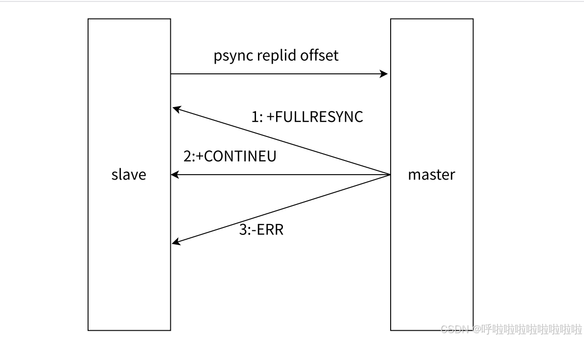 1)从节点发送 psync 命令给主节点,replid 和 offset 的默认值分别是 ? 和 -1. 2)主节点根据 psync 参数和自身数据情况决定响应结果: