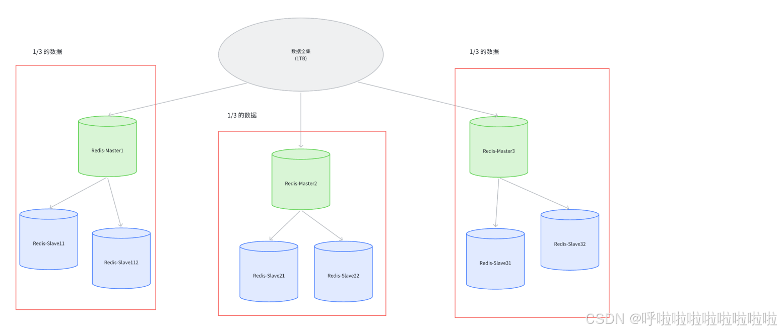 上述的哨兵模式,虽然提高了系统的可用性,但是真实存储数据的还是主节点和从节点,所有的数据都存储在主从节点上;如果数据量超过了主从节点的内存上,那么就可能出现严重问题了~