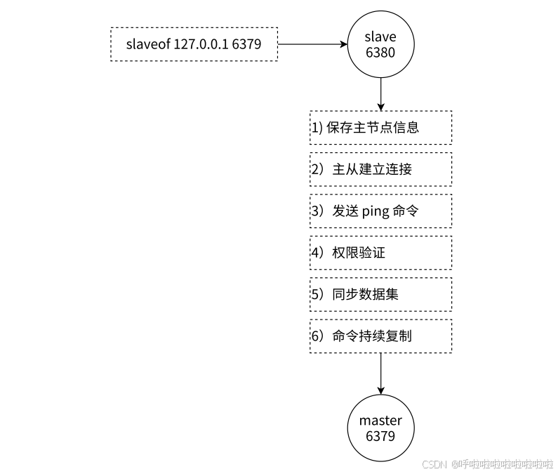 1.先保存主节点的ip和端口变量等信息 2、建立TCP的网络连接,三次握手,为了验证通信双方是否能够正确的读写数据 3.验证主节点是否能够正常的工作 从节点发送ping命令 主节点返回pong 4.如果主节点设置了 requirepass 参数,则需要密码验证