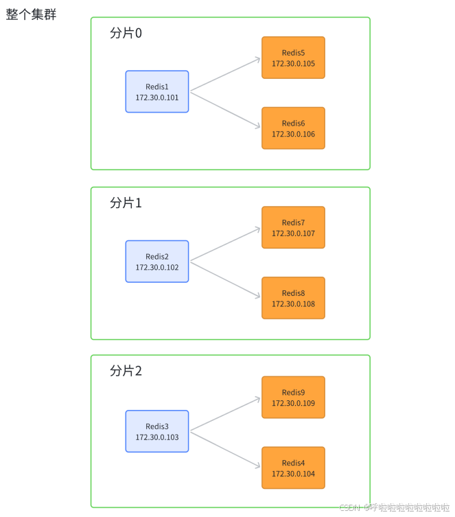 从节点必须听主节点,从节点内的数据跟主节点保存同步(从节点就是主节点的副本)~