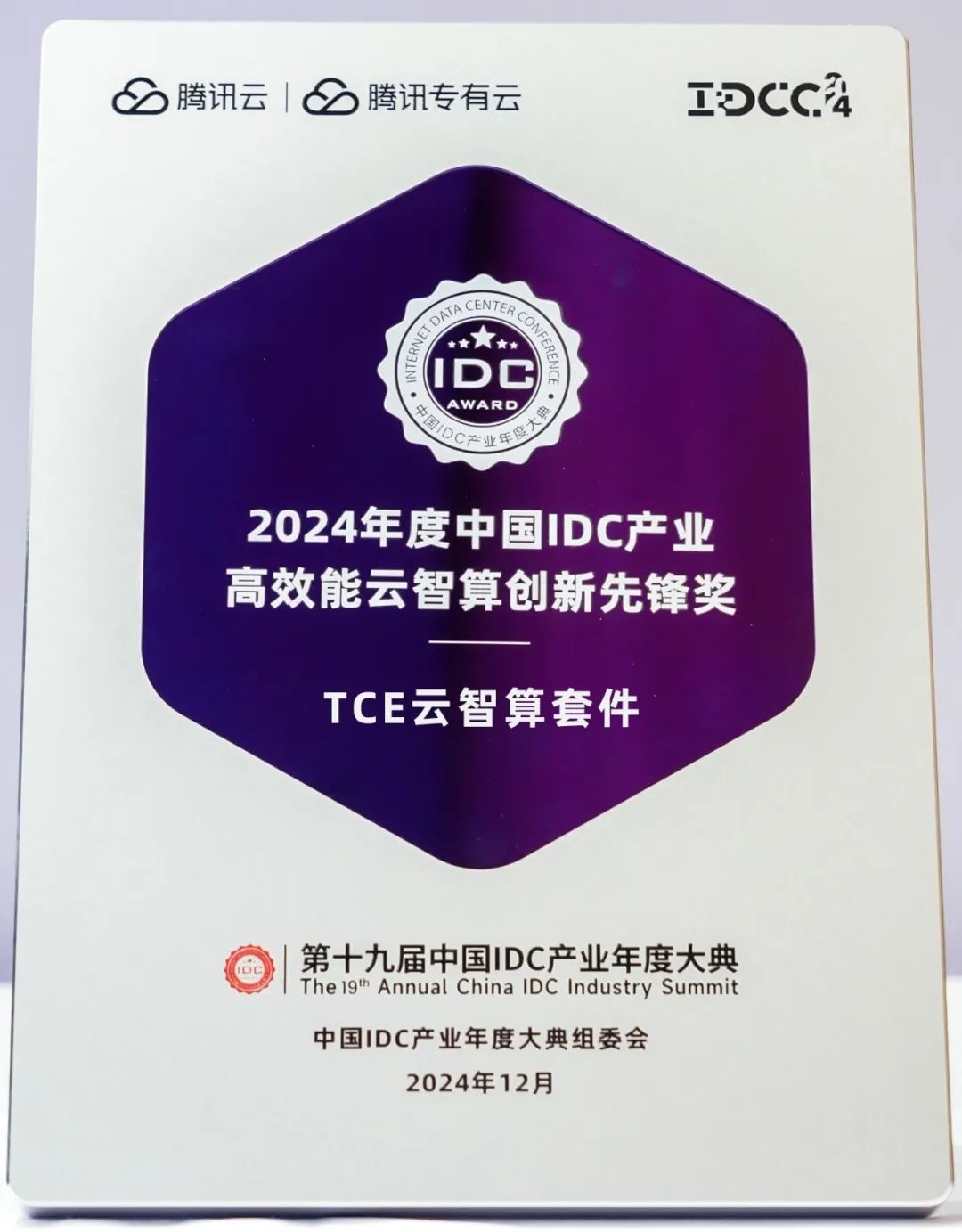 凭借着卓越的技术实力,TCE云智算套件在刚刚落幕的2024年中国IDC产业年度大典上,荣获2024年度中国IDC产业高效能云智算创新先锋奖,这一荣誉无疑是对腾讯专有云技术实力与创新成果的高度认可。