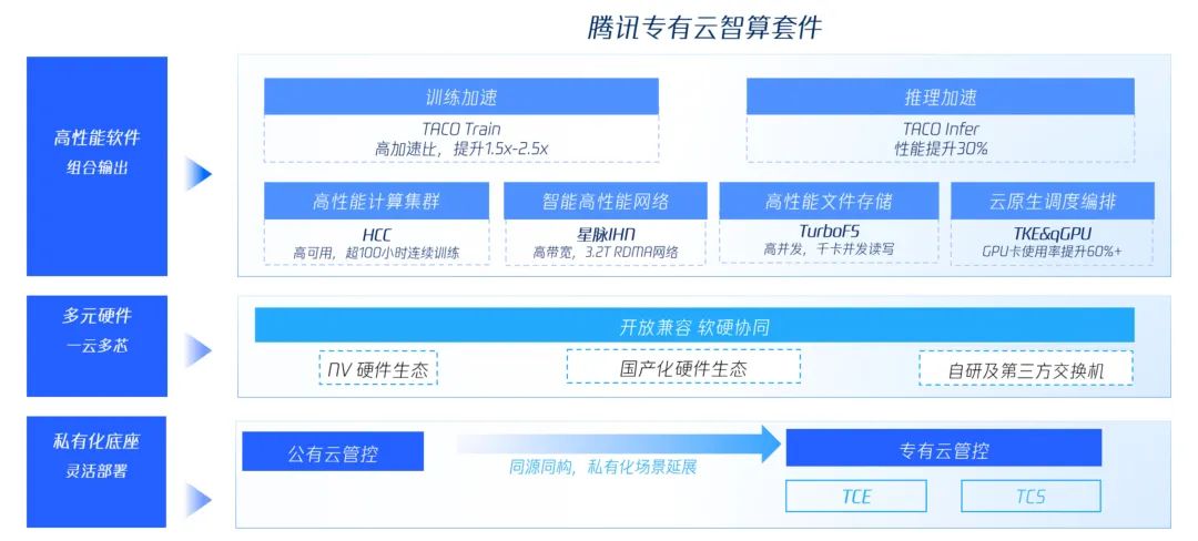 腾讯专有云TCE云智算套件,基于公有云的智算产品能力,在私有云场景下输出腾讯云高性能计算集群HCC、智能高性能网络IHN星脉、高性能并行文件存储TurboFS、算力加速框架Taco以及GPU算力共享技术等核心能力,支撑企业搭建高性能智算云,解决客户智算本地化、数据安全、数据隐私等诉求。
