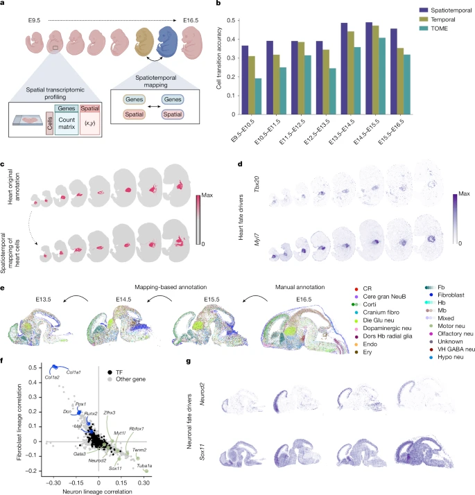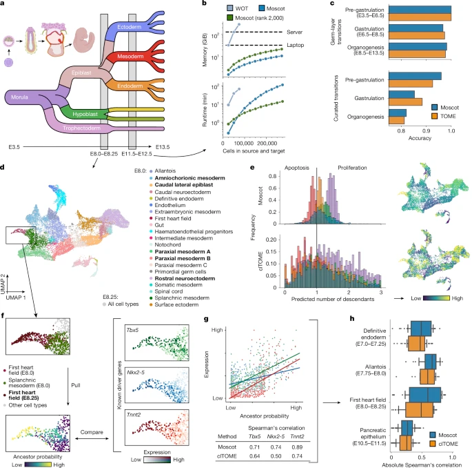 在小鼠胚胎发育图谱(20个时间点,170万细胞)中,moscot成功解析心脏祖细胞分化路径,其预测的祖先概率与关键驱动基因(如Tbx5、Nkx2-5)表达高度相关,准确率超越kNN-based方法TOME。