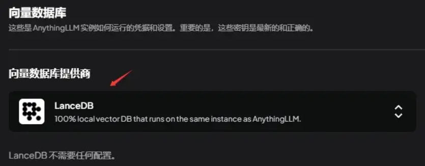 在AnythingLLM的设置界面中,点击“向量数据库”,您可以将向量数据库的配置选择为LanceDB。这一步骤将确保您的应用程序利用LanceDB的高效数据检索能力,