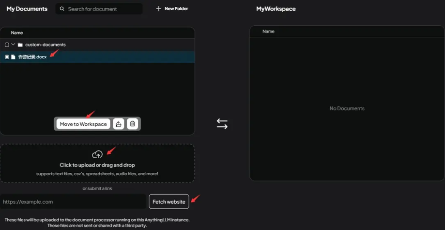 在AnythingLLM中,您拥有灵活的内容添加方式:既可以直接上传文件,也可以输入指定的网页地址。一旦内容成功添加,它们将出现在"My Documents"栏目中,清晰列出以供查阅。若您希望将这些内容纳入当前工作环境,只需在"My Documents"栏目中选中所需项目,随后点击"Move to Workspace"按钮,即可将其整合进您当前的Workspace,便于进一步的操作和分析。这一流程设计旨在提升您的工作效率和内容管理的便捷性。