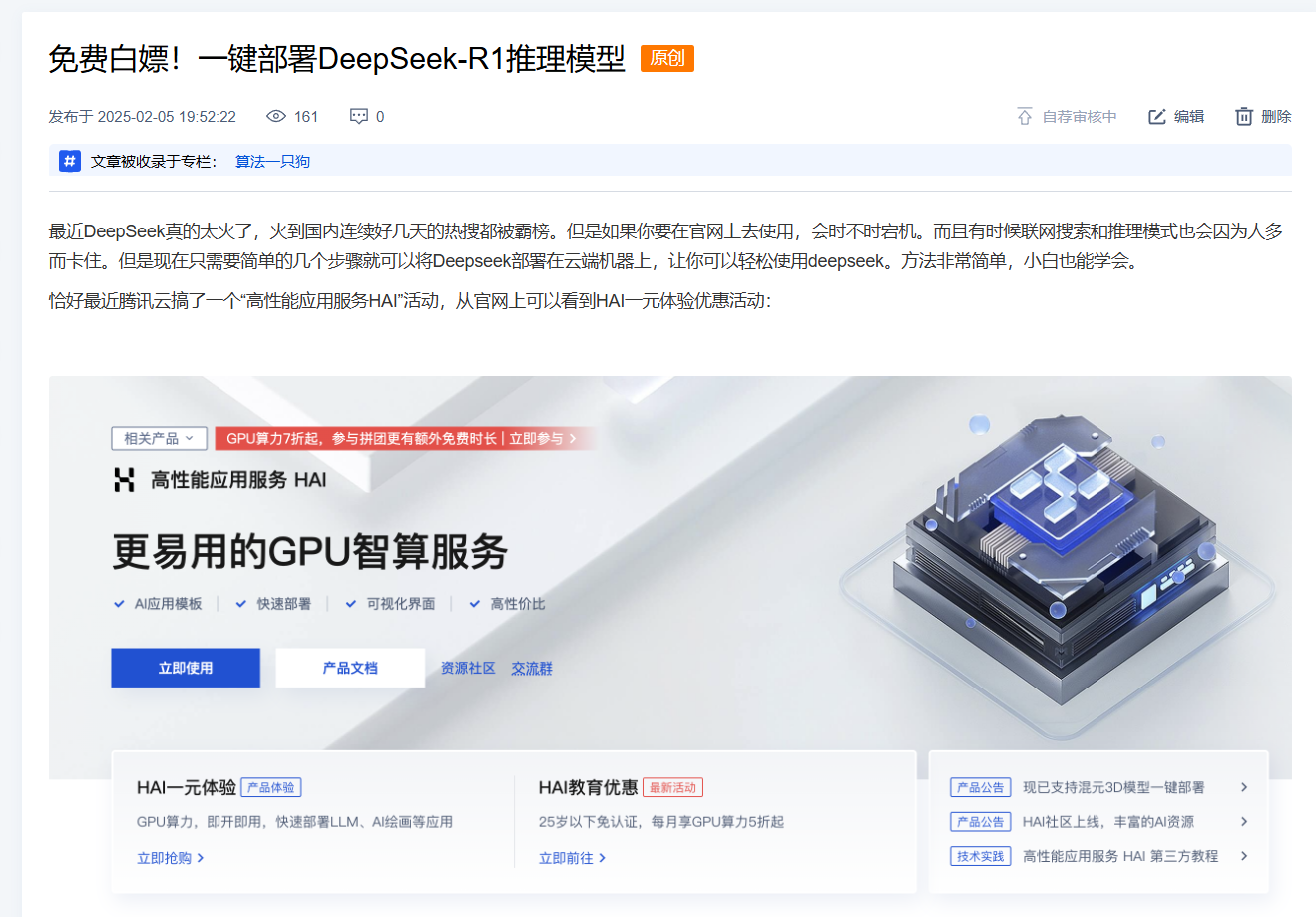 我之前曾经介绍基于腾讯云HAI,在几分钟快速部署一个属于自己的DeepSekk-R1大模型。这里就不再过多描述部署步骤了