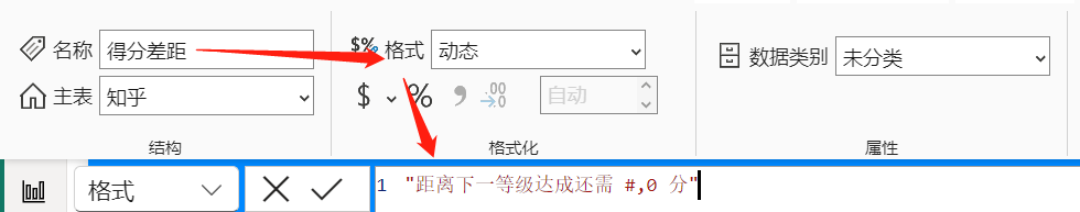 实际比目标 = FORMAT([实际得分],"#,#") & " / " & FORMAT([目标得分],"#,#")把得分差距度量值的格式调整为动态,前后加上中文: