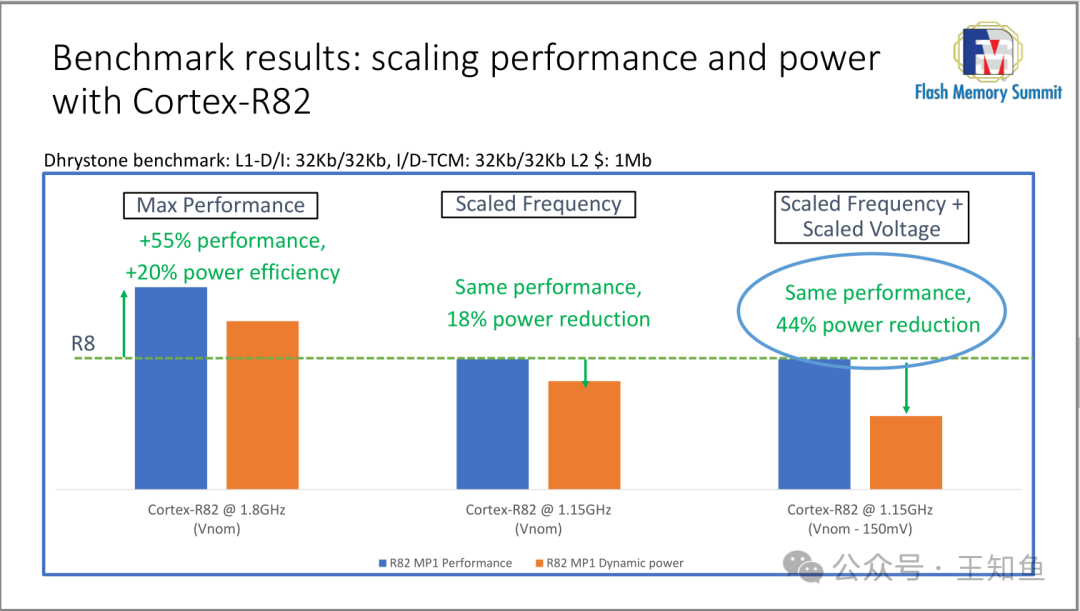 展示了Cortex-R82处理器在不同频率和功率条件下的基准测试结果。它显示了在1.8GHz时,性能提升了55%,且功耗效率提高了20%。