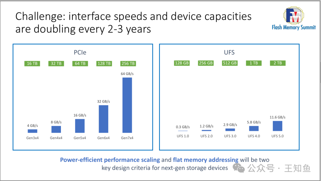 展示了PCIe和UFS接口的速度与存储容量的快速增长,强调了在未来2-3年内,这些技术将继续双倍增长的挑战。PCIe的速度从4 GB/s到64 GB/s,而UFS则从0.3 GB/s提升至11.6 GB/s。