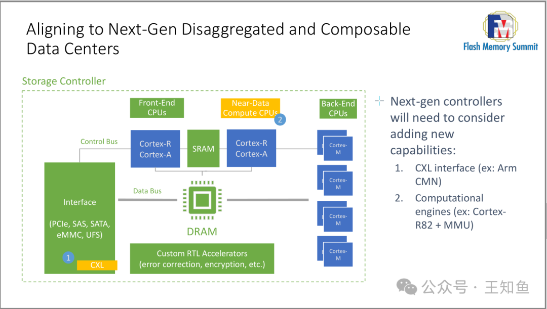 展示了下一代解耦和可组合数据中心的存储控制器架构,强调了不同类型 CPU(前端、近数据、后端)和存储组件(如 SRAM 和 DRAM)的协作。图中提到,未来的控制器需整合新功能,包括 CXL 接口和计算引擎,以提升性能和灵活性。