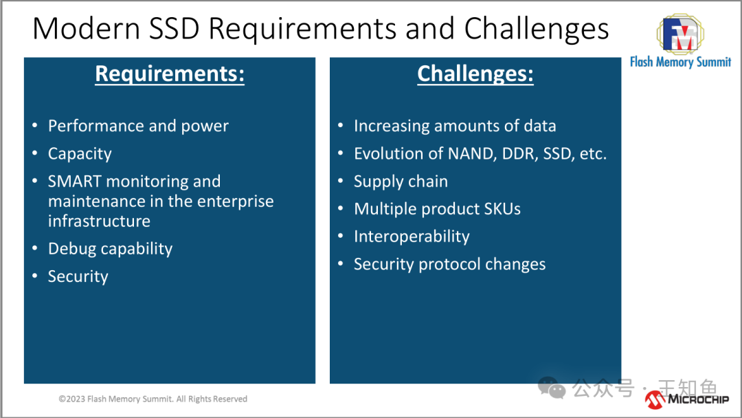 - 性能和功率- 容量- 在企业基础设施中进行SMART监控和维护- 调试能力- 安全性 | - 数据量的增加- NAND、DDR、SSD等技术的演变- 供应链- 多种产品SKU- 互操作性- 安全协议的变化 |