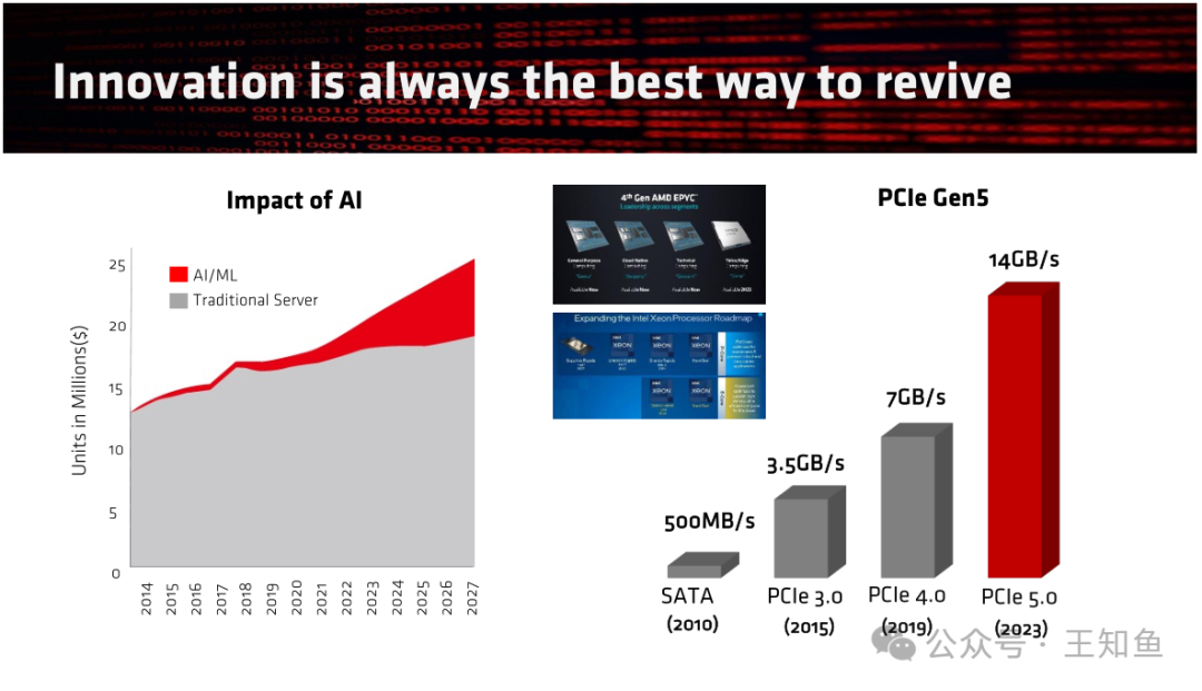 右图描述典型存储接口传输速率,基于先进PCIe接口的存储设备在将来有巨大需求。
