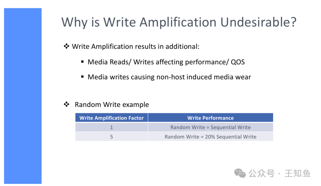 - 3. 随机写入效率低下:通过示例说明,当写入放大因子为5时,随机写入的性能仅为顺序写入的20%,凸显了写入放大对随机写入性能的严重影响。
