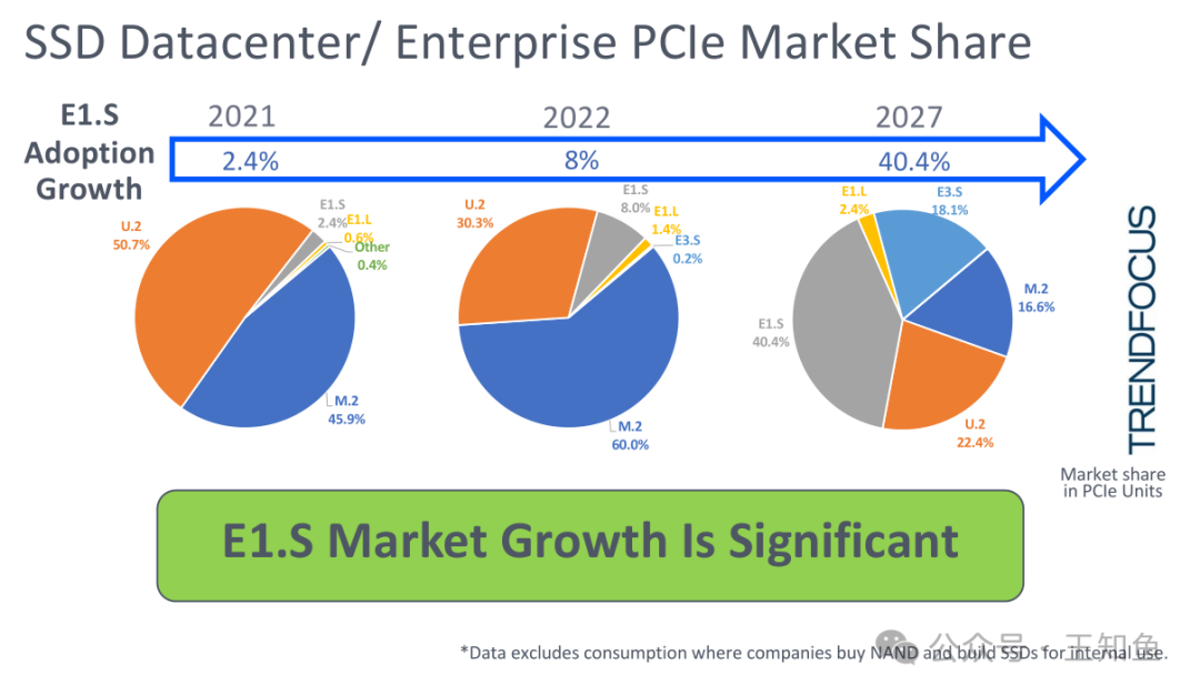 - • 企业级存储接口标准 EDSFF在未来将持续占据市场空间,其中E1.S占比最大