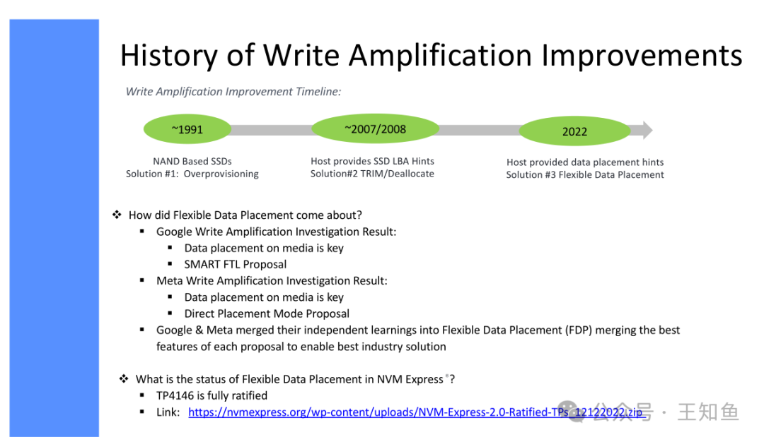 - 1. 时间线:从1991年的NAND基础SSD开始,经过2007/2008年的LBA提示,到2022年的灵活数据放置,显示了写入放大技术的三个主要阶段。