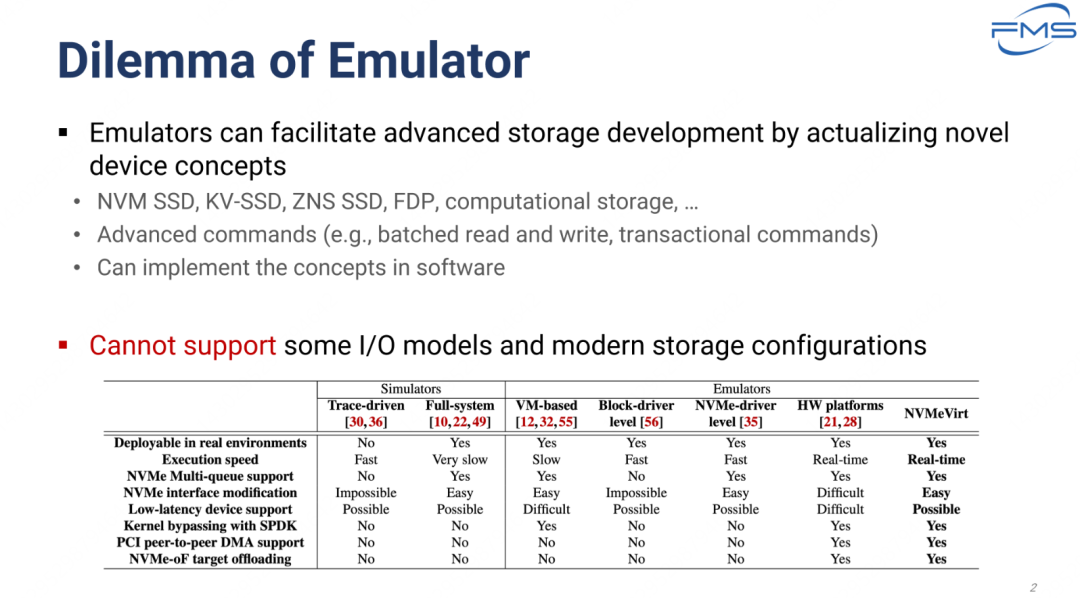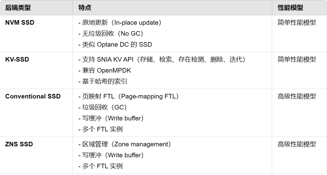 图中表格比较不同模拟器技术在NVMe 多个特性上的支持情况。