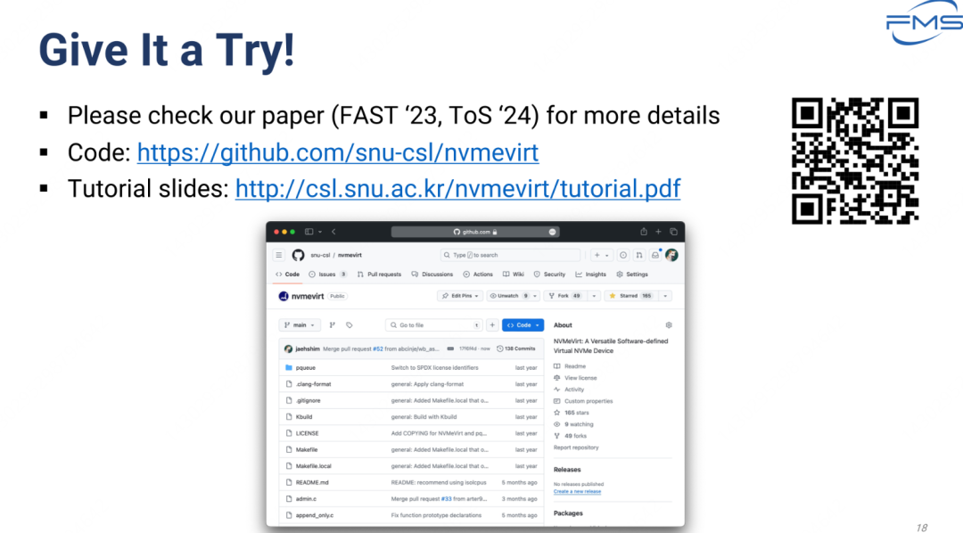 文档介绍NVMeVirt,一个基于软件的虚拟NVMe设备模拟器,及其在加速存储系统研发中的应用。