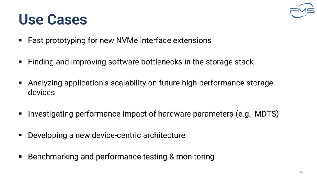 列举了与 NVMe 存储技术相关的多种应用场景,重点是性能优化、扩展性分析和硬件架构改进。它展示了如何利用这些用例来推动高性能存储设备和相关技术的发展。