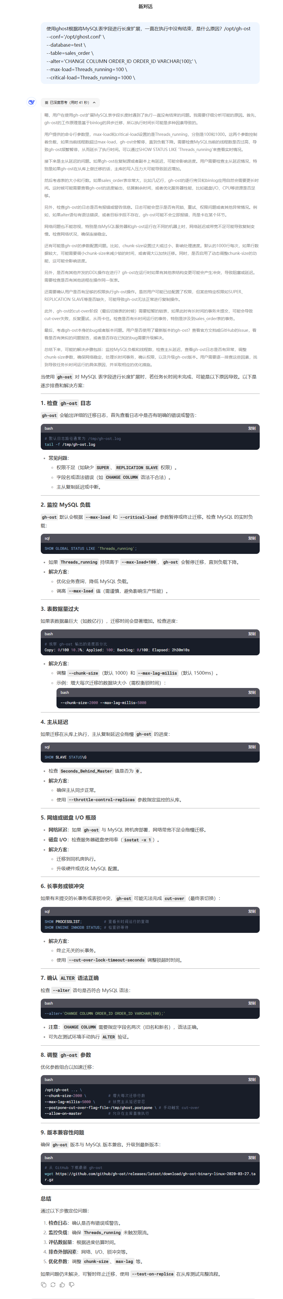 首先提到了常见的问题原因,例如权限不足、语法错误、主从复制、数据库负载、表数据量过大、主从延迟, 网络或磁盘 I/O 瓶颈,长事务或锁冲突,ALTER 语法错误,调整 gh-ost 参数等。然后列出了一些排查步骤,包括检查 gh-ost 日志、监控 MySQL 负载、检查表数据量、检查磁盘使用率、检查长事务与锁状态、检查 ALTER 语法、检查 gh-ost 版本与 MySQL 版本兼容性等。
