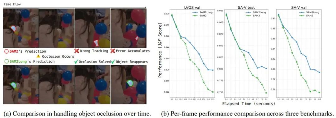 因为 SAM2Long 也只需要处理一次图像编码器,所以内存树结构的引入几乎不会增加显著的计算成本,但却显著提高了模型在长时间视频场景中的鲁棒性和对错误的恢复能力。