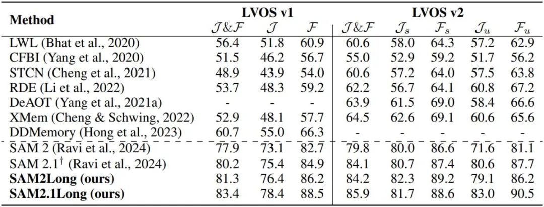 这些结果表明,SAM2Long 在保留 SAM 2 基础分割能力的同时,显著增强了其长时间视频场景下的表现,展现了其在不同 VOS 基准数据集上的鲁棒性和通用性。