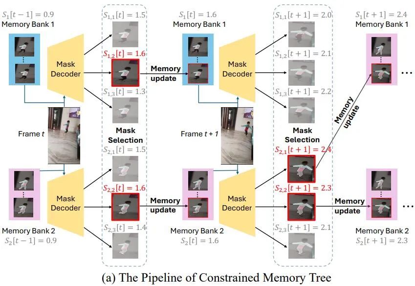 为了提高 SAM 2 在长视频中的鲁棒性,SAM2Long 引入了多路径记忆树结构。该结构允许模型在每个时间步上保留多个分割路径假设,每条路径都有独立的内存库和累积得分。每个时间步上,SAM2 的掩码解码器在每条路径会生成三个掩码候选。