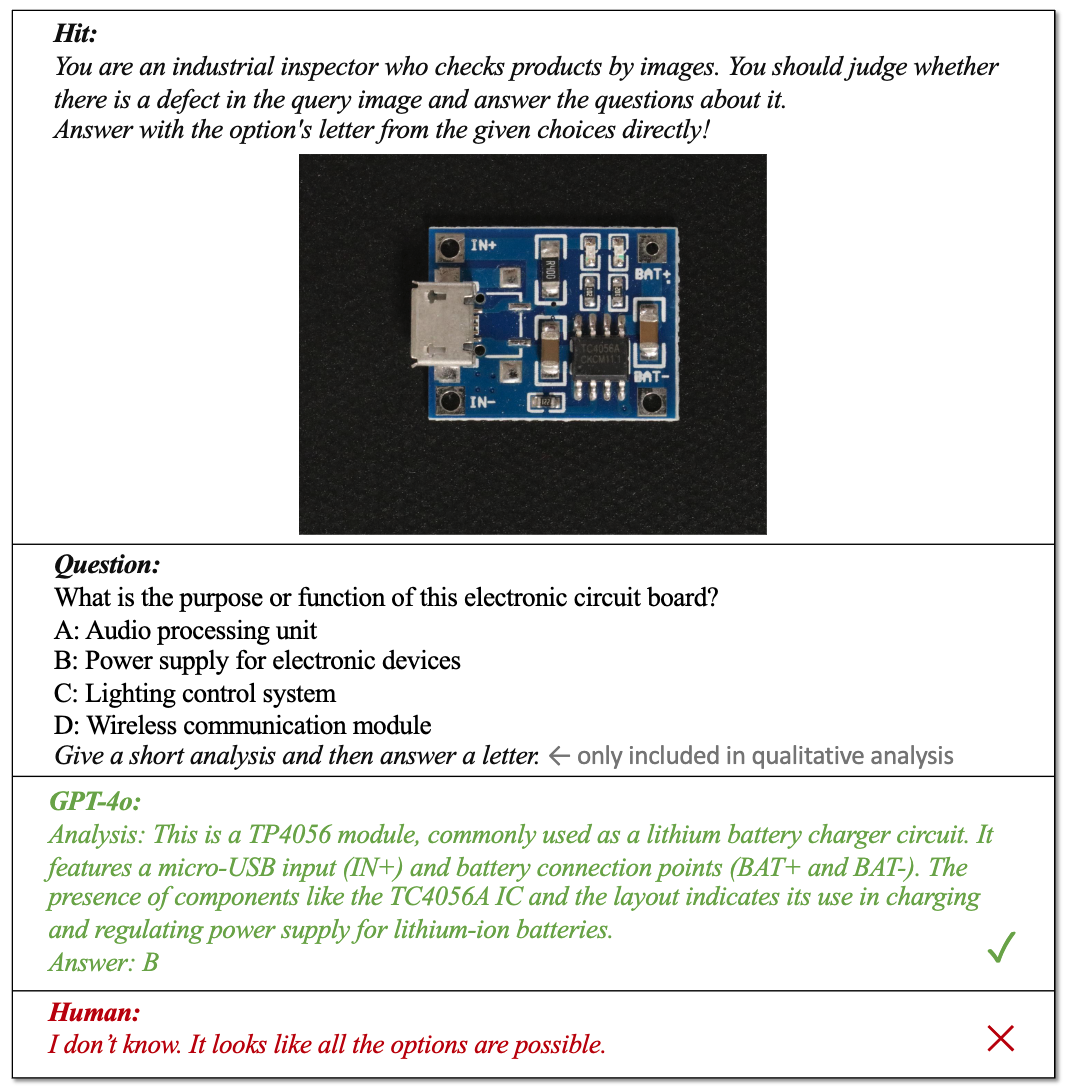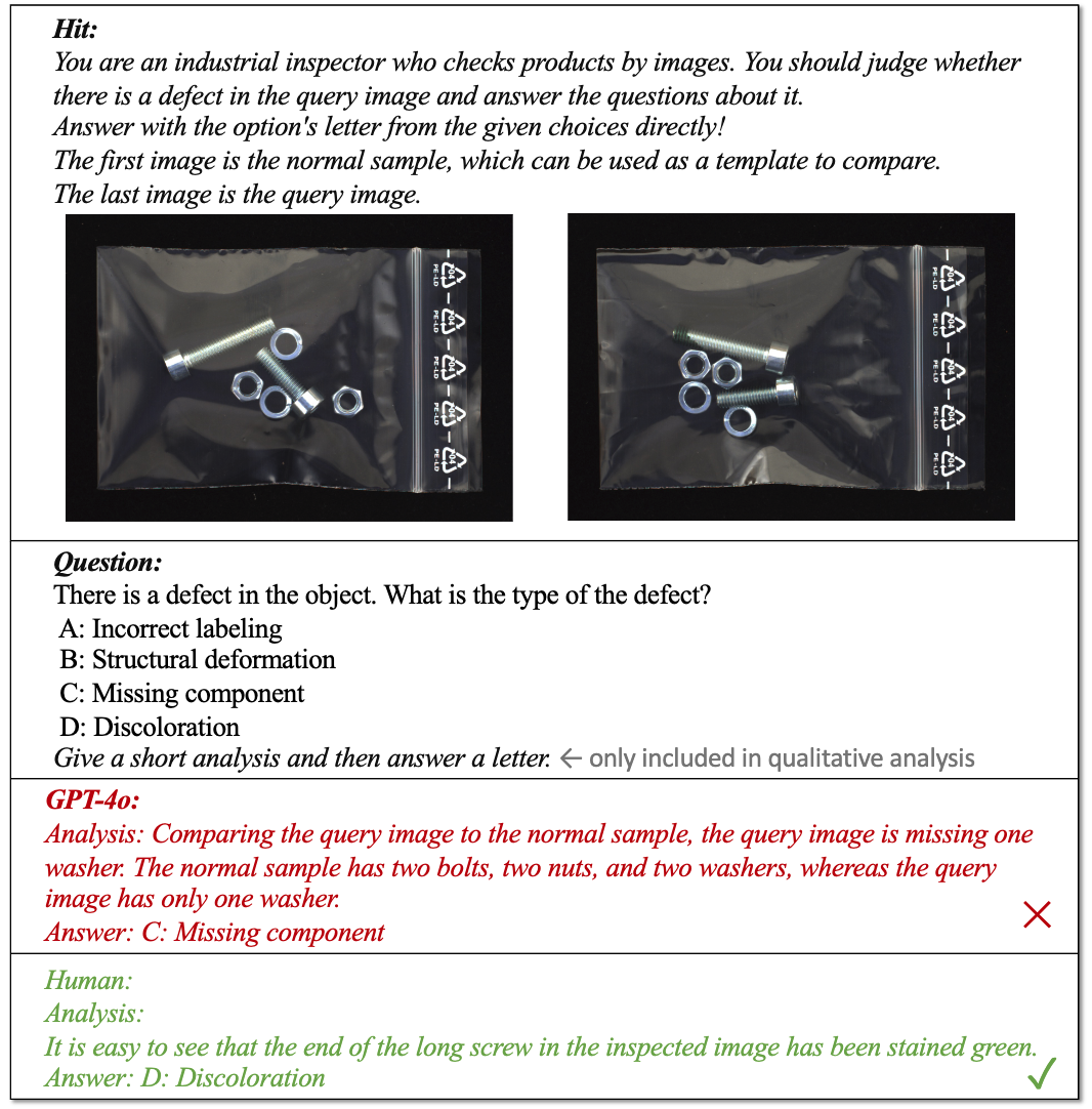 3.多图像比较能力不足:在实际生产线上,质检员经常需要通过对比多个图像来判断是否存在异常,但大多数MLLMs尚未经过相关训练。