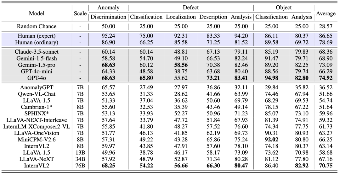 ● 专为工业设计的AnomalyGPT表现最差(36.5%),暴露过拟合问题