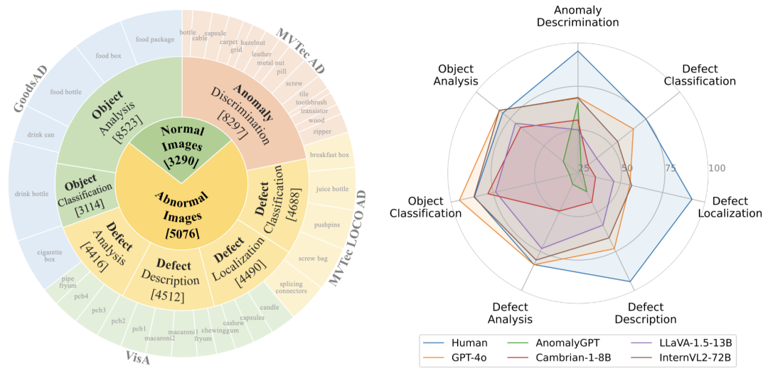 (右)性能雷达图,表现最好的GPT-4o也在异常相关的问题上与人类有较大差距。