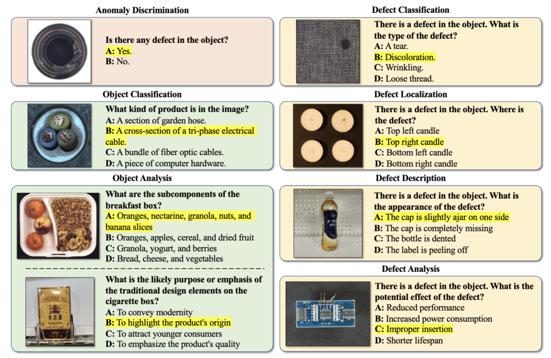 为了全面评估MLLMs的工业质检能力,我们设计了覆盖7大核心子任务的测评体系: