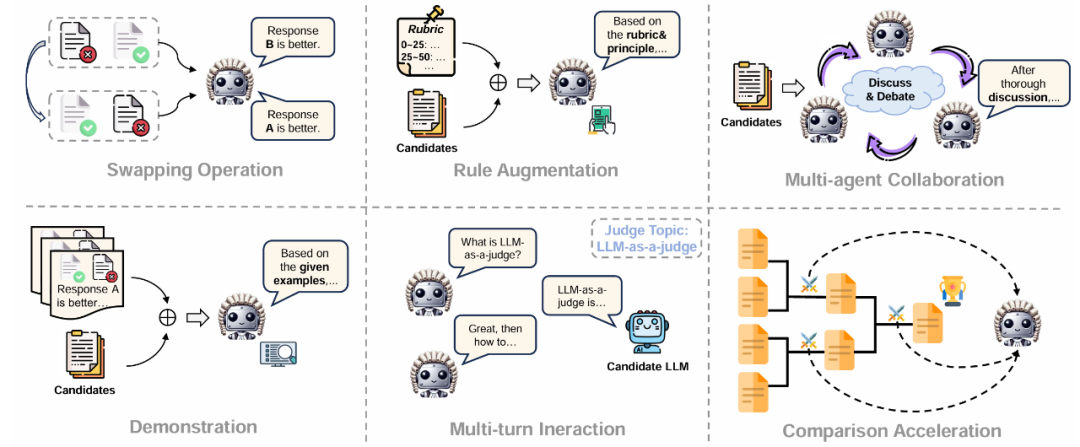 (2)提示:提示(prompting)技术可以有效提升 LLM-as-a-judge 的性能和效率。在这一章节中,我们总结了目前工作中常用到几类提示策略,分别是:交换操作,规则增强,多智能体合作,演示增强,多轮动态交互和对比加速。